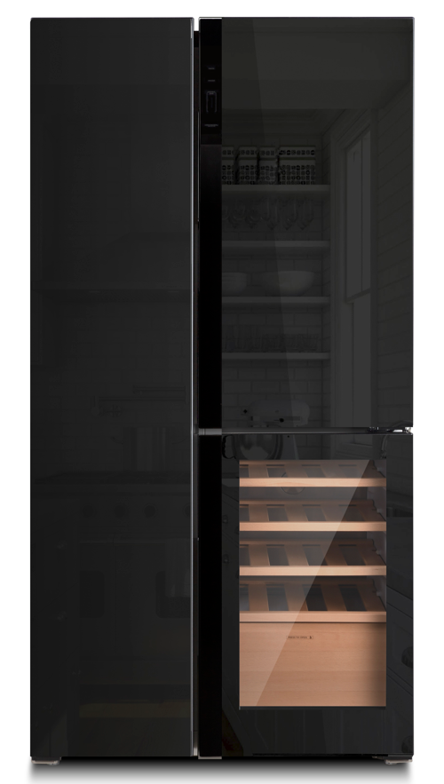 მაცივარი და საყინულე შავი მინის კარით