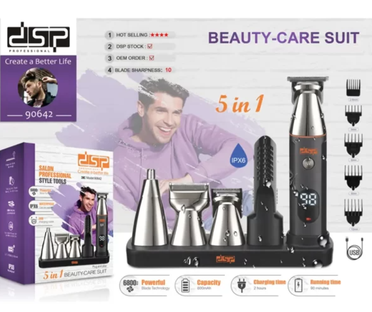 5W 600mAh 5-ში-1 მრავალჯერადი დატენვის ლითიუმის ბატარეა IPX6 უჟანგავი ფოლადის მოვლის ნაკრები სხეულის სახის ცხვირისა და ყურისთვის ჩაშენებული LED დისპლეით 90642
